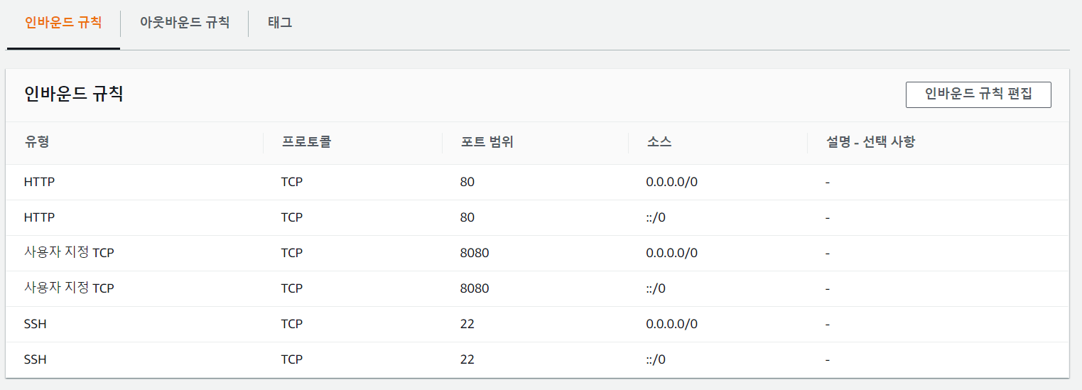 +) 만약 어떻게해도 안 된다면 보안그룹 규칙에 포트범위 8080이 추가되어 있는지 확인해주세요.