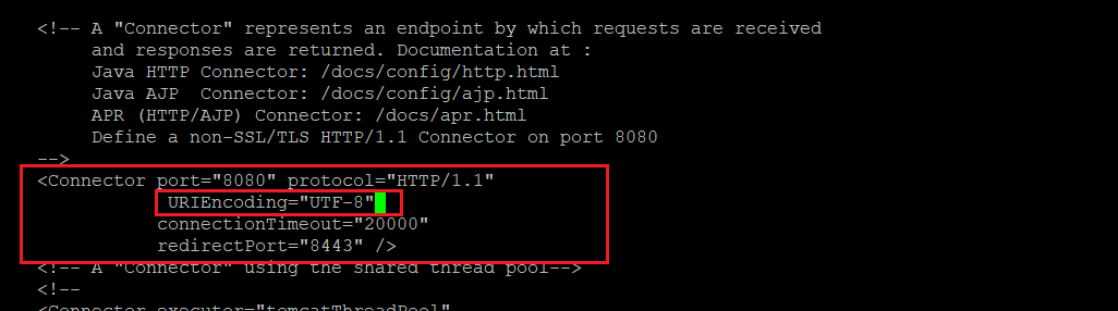 아래 내용부분을 찾은 뒤 i를 눌러 insert모드로 변환한 후, URIEncoding을 추가합니다.