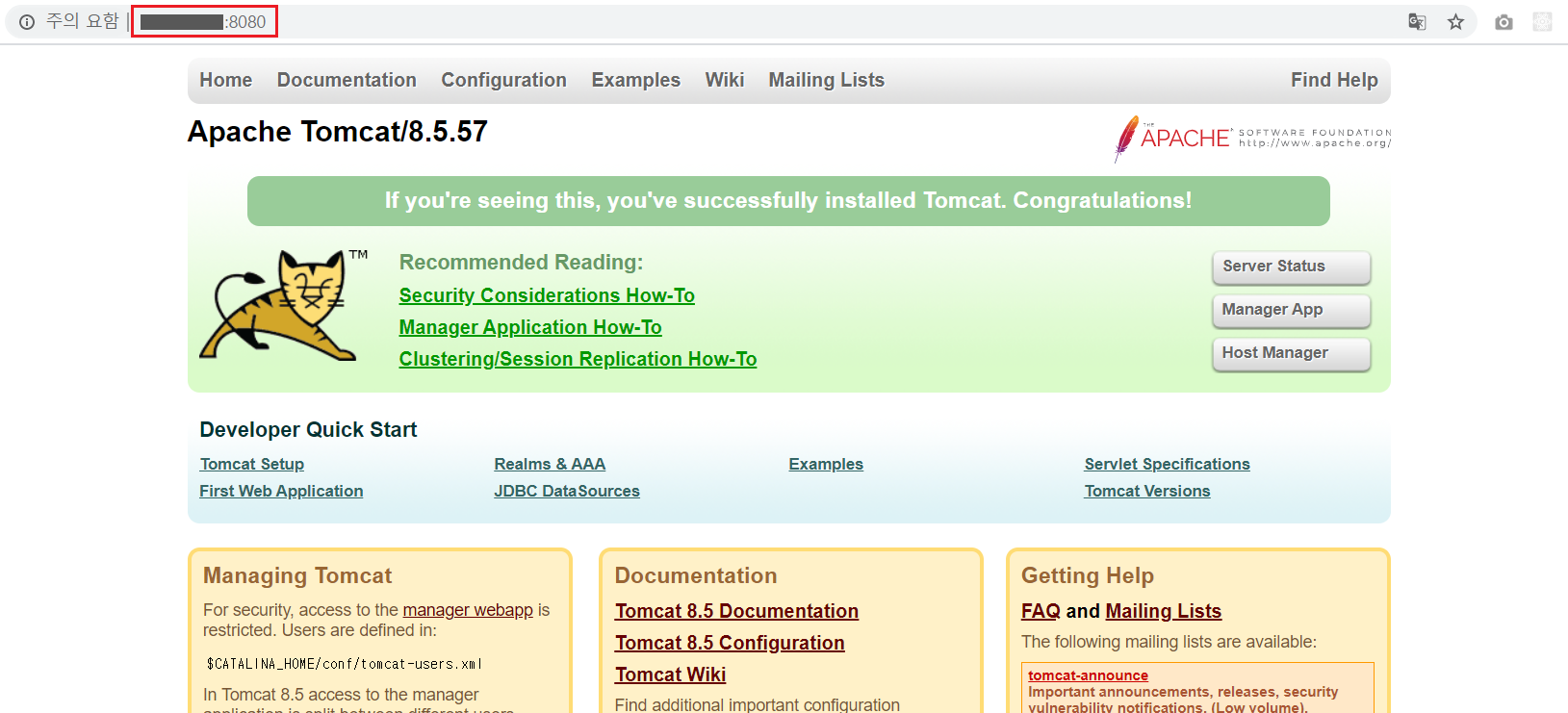 http://[IPv4 퍼블릭 IP주소]:8080/로 접속했을 때 아래와 같이 잘 뜨면 톰캣이 정상적으로 작동하고 있는 것 입니다.