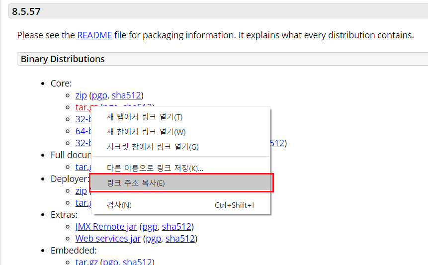 톰캣 홈페이지 접속하여 다운로드 주소 복사