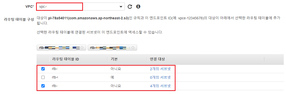 > Endpoint와 연결될 VPC와 라우팅 테이블을 선택(라우팅 테이블 선택을 통해 Gateway 방식임을 알 수 있음)
