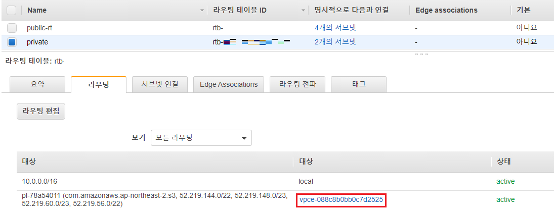 > 이후 Endpoint 생성 시 선택했던 라우팅 테이블 내부에, "vpce-~"를 대상으로 한 라우팅이 자동적으로 추가되었음을 확인 가능