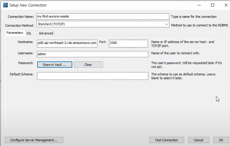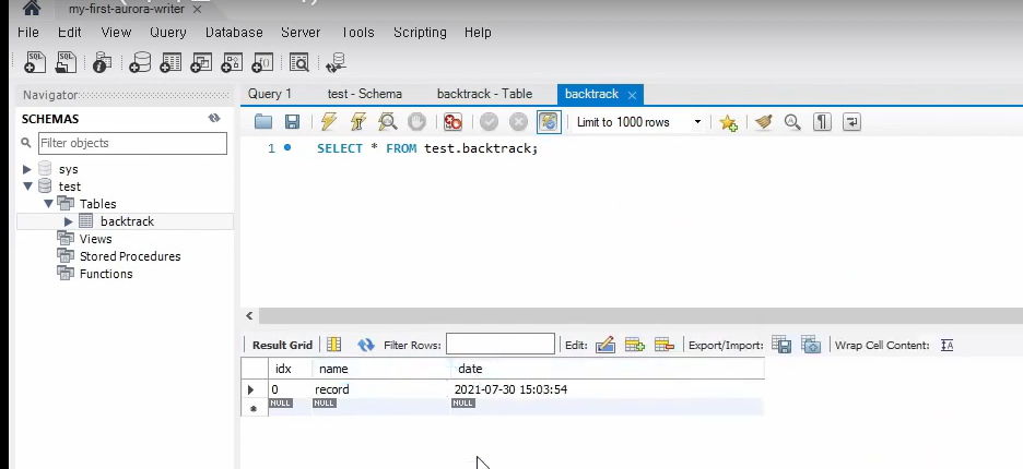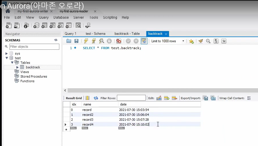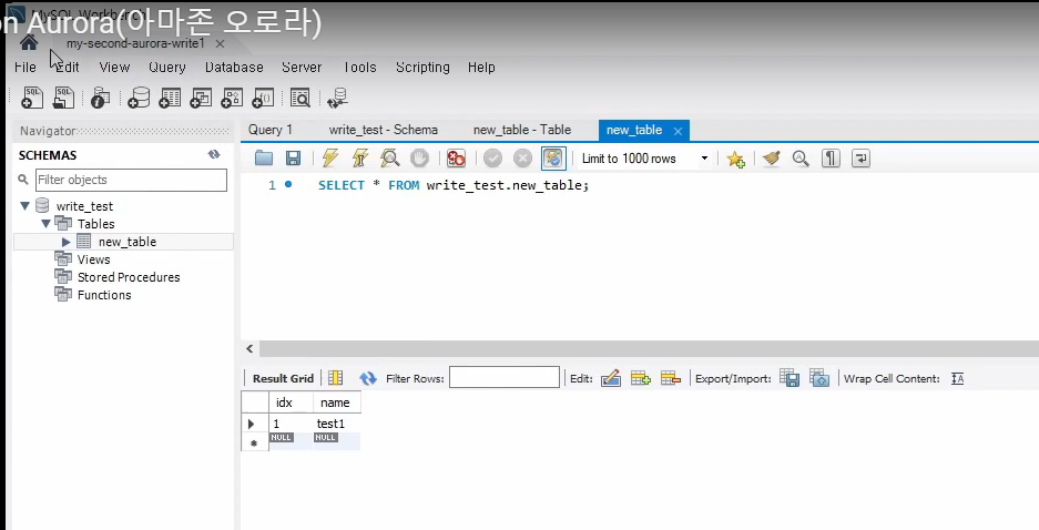 - Reader 엔드포인트 --> Workbench 로 접속 (데이터 확인) - (첫번째 레코드 생성후 접속 화면)