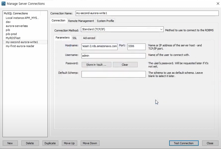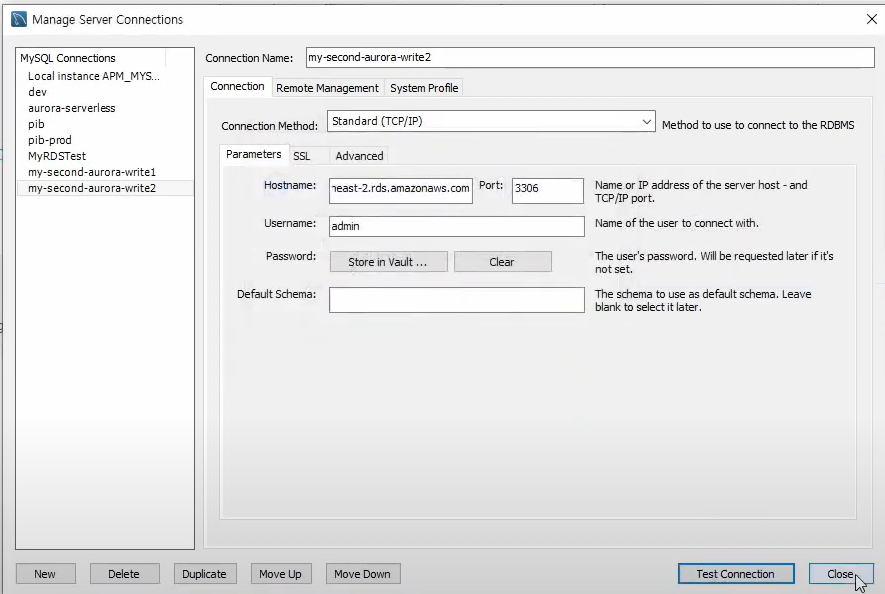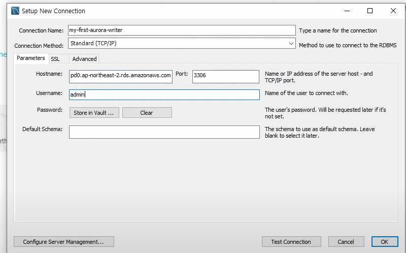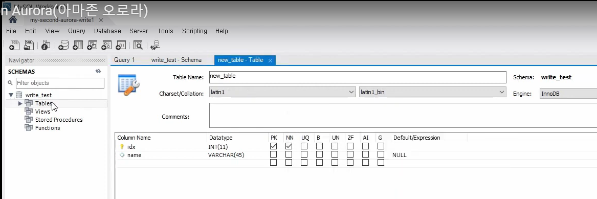 - Writer 엔드포인트 --> Workbench 로 데이터베이스 생성 (test DB 생성)