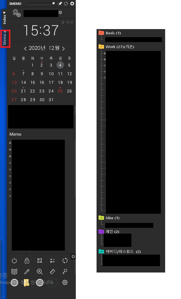 메모는 바탕화면에 메모를 고정 시켜, 자주 쓰는 메모를 바로 볼 수 있다.