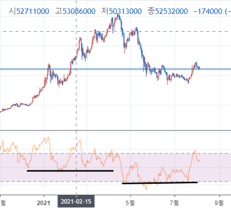 - 차트가 횡보하고 있는데 RSI가 상승하면 매도가 더 이상 나오고 있지 않다고 해석할 수 있다(긍정 신호).