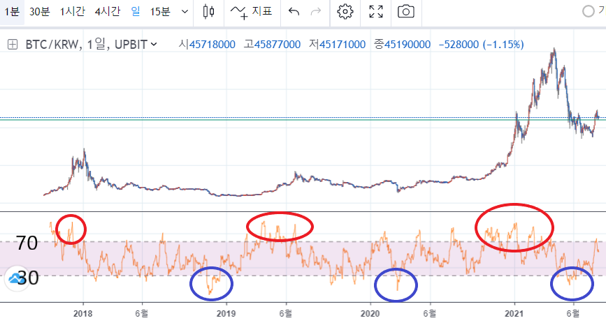 업비트의 비트코인 일봉 차트입니다. 왼쪽 숫자는 과매수 구간인 70과 과매도 구간인 30을 표시해두었고, 빨간색 동그라미는 과매수 구간 표기, 파란색 표기는 과매도 구간 표기입니다. 빨간색 구간이 오면 하락하는 모습을 볼 수 있고, 파란색 구간이 오면 가격이 상승하는 모습을 볼 수 있는데요.