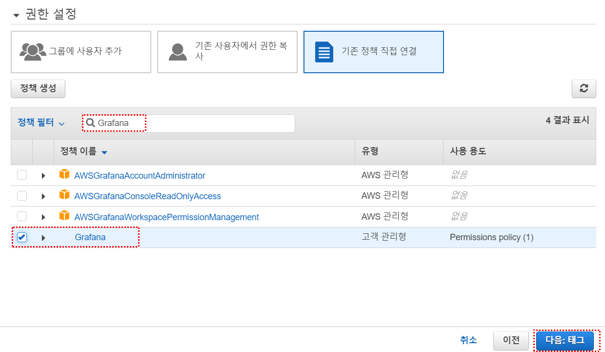 - 기존 정책 직접 연결을 선택 후 Grafana를 검색한다. 검색 결과에서 Grafana를 선택 후 다음을 클릭한다.