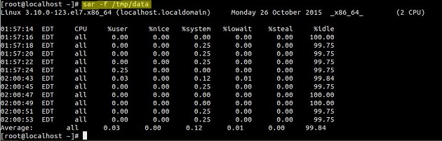 | [root@localhost ~]# sar 2 5 -o /tmp/data > /dev/null 2>&1 [root@localhost ~]# |