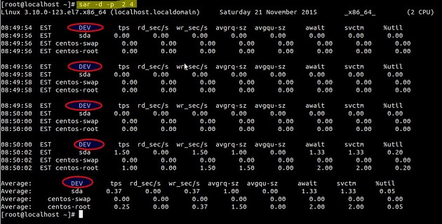 | [root@localhost ~]# sar 2 5 Linux 3.10.0-123.el7.x86_64 (localhost.localdomain) Monday 26 October 2015 _x86_64_ (2 CPU) 01:43:55 EDT CPU %user %nice %system %iowait %steal %idle 01:43:57 EDT all 0.00 0.00 0.25 0.00 0.00 99.75 01:43:59 EDT all 0.00 0.00 0.00 0.00 0.00 100.00 01:44:01 EDT all 0.00 0.00 0.25 0.00 0.00 99.75 01:44:03 EDT all 0.00 0.00 0.25 0.25 0.00 99.50 01:44:05 EDT all 0.00 0.00 0.00 0.00 0.00 100.00 Average: all 0.00 0.00 0.15 0.05 0.00 99.80 [root@localhost ~]# |