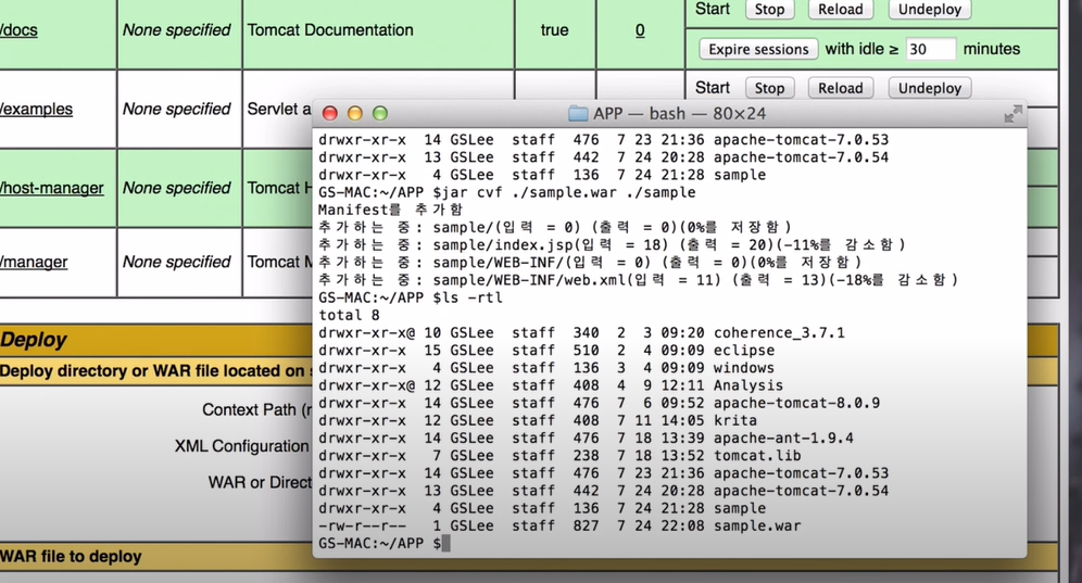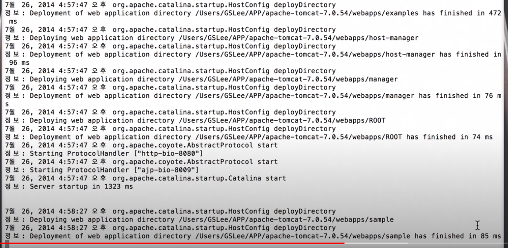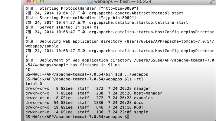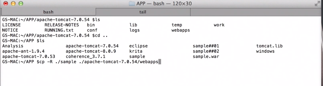 - cp -R ./sample ./apache-tomcat-7.0.54/webapps 로 파일 복사