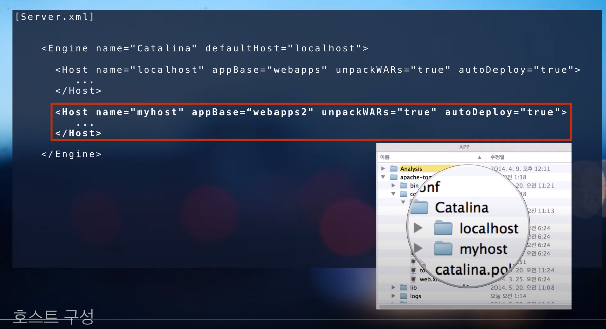 - 아파치에서도 가상호스트를 지원하나, 부하가 적고 간단히 톰캣에서도 구현 가능.