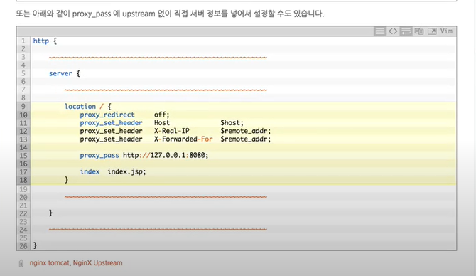 ## 방법2. 아래와 같이 proxy_pass 에 upstream 없이 직접 서버정보를 넣어서 설정할 수도 있음