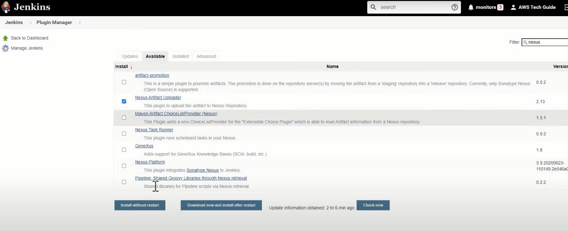 - Nexus Artifact Uploader 다운로드 (Install without restart 선택)