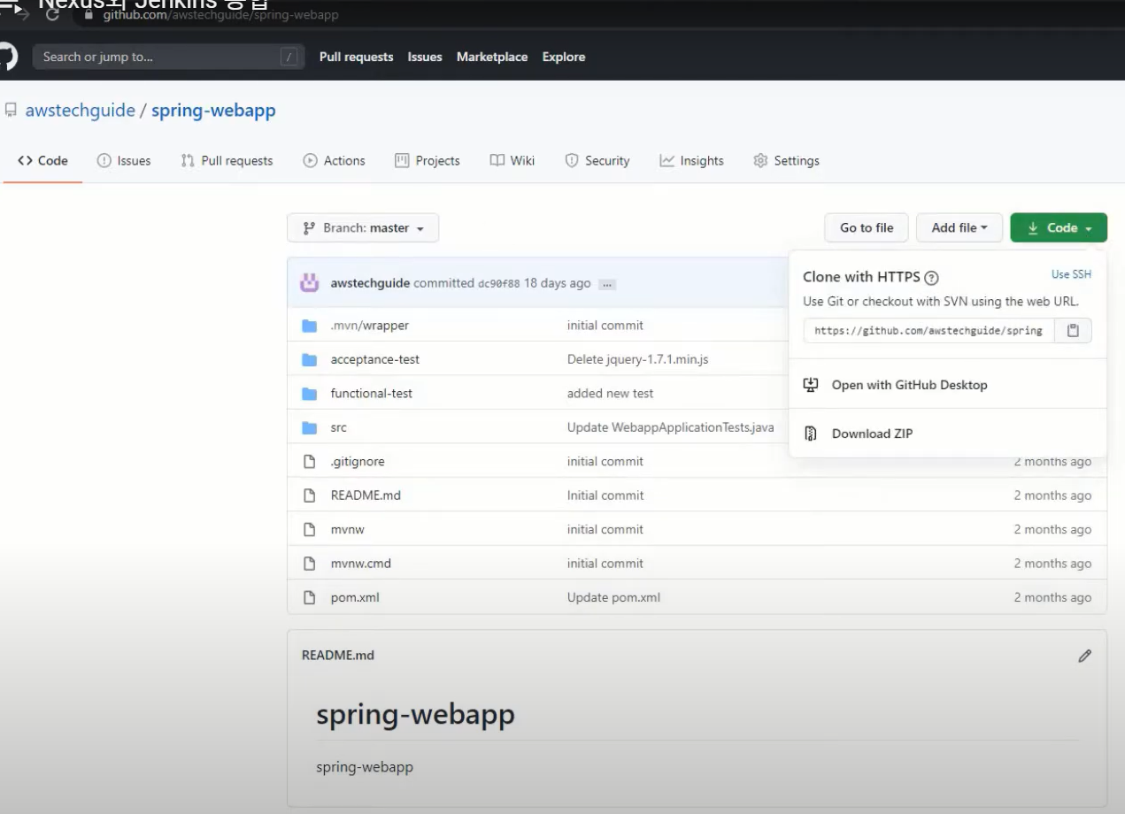 - 깃허브 주소 복사 후 (github.com/awstechguide/spring-webapp.git)