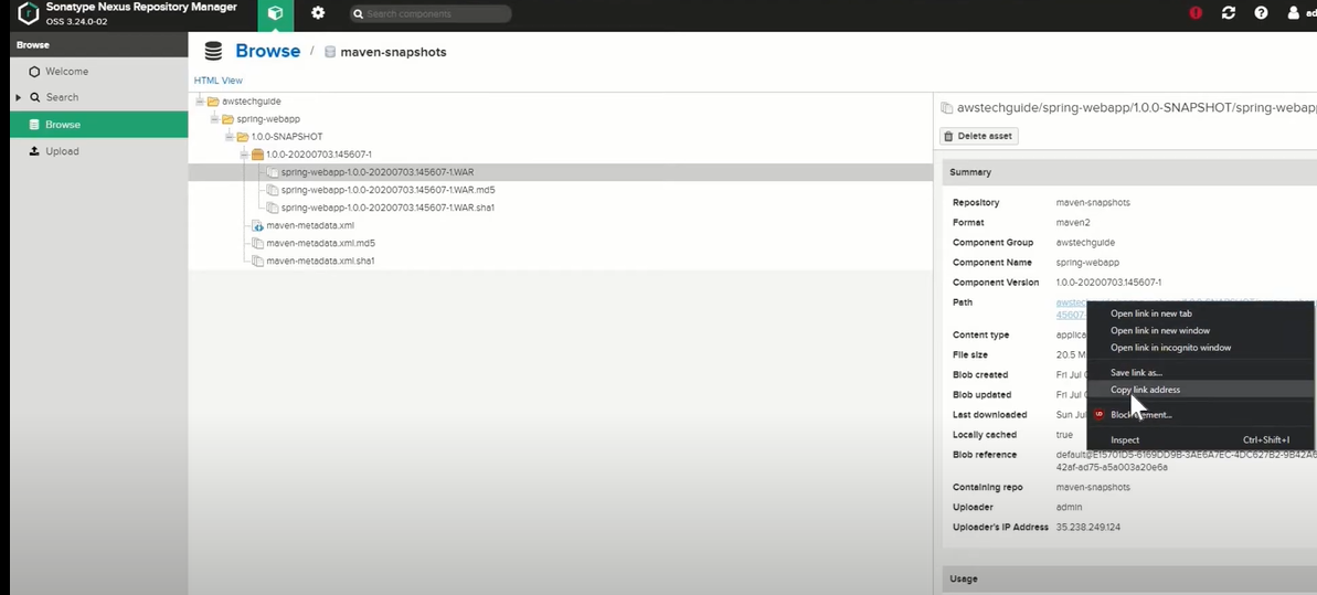 wget --user=admin --password=admin http://35.184.138.42:8081/repository/maven-snapshots/awstechguide/spring-webapp/1.0.0-SNAPSHOT/spring-webapp-1.0.0-20200703.145607-1.WAR