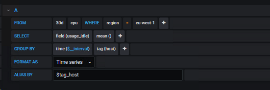 SELECT mean("usage_idle")*-1+100 FROM "30d"."cpu" WHERE ("region" = 'eu-west-1') AND $timeFilter GROUP BY time($__interval), "host"