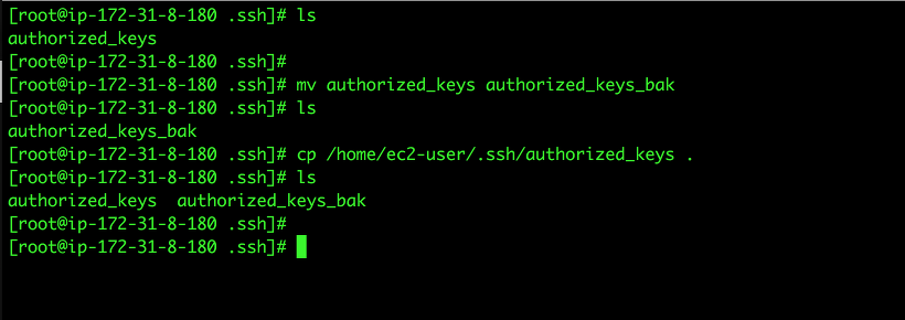 세번째로는 ~/.ssh 디렉터리 안에 authorized_keys를 EC2서버에 디폴트로 접속할때, 사용하는 ec2-user의 authorized_keys로 변경합니다. /home/ec2-user/.ssh/authorized_keys를 ~/.ssh 디렉터리 하위에 복사합니다.