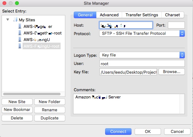 (Host는 EC2서버 IP를 입력하고, Port - 22, Protocol은 SFTP, User는 root, Logon Type 은 Key file로 변경하고, 인스턴스 생성 시 할당받은 pem파일을 설정합니다.)