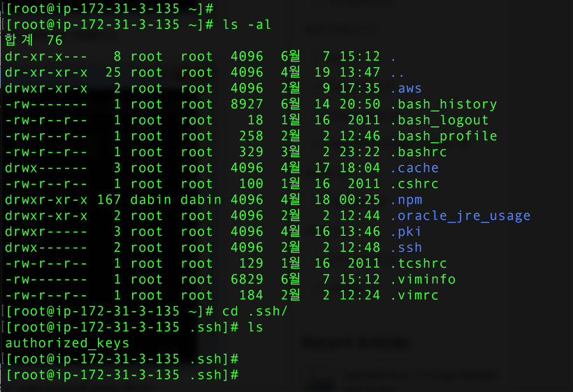 (변경 이유는, terminal에서 EC2서버에 접속할때, 인스턴스 생성 시 할당받은 pem파일을 가지고 root계정으로도 접속되도록 하기 위함입니다.)