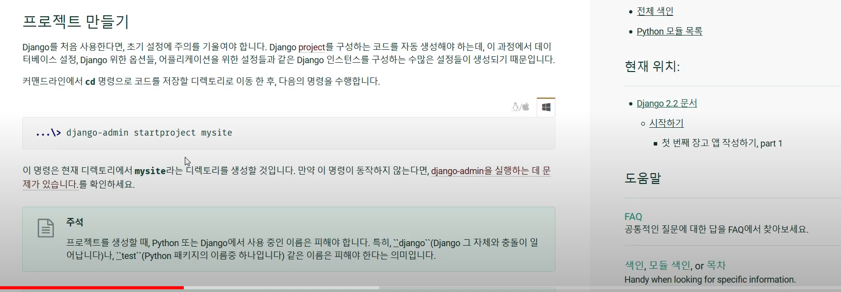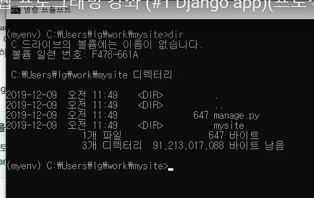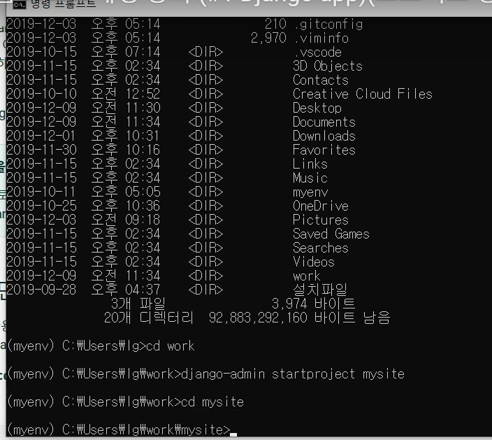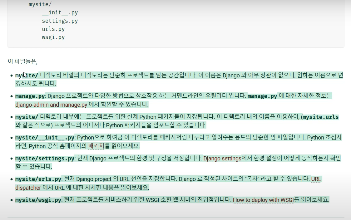 - django-admin startproject mysite (mysite 프로젝트 생성)