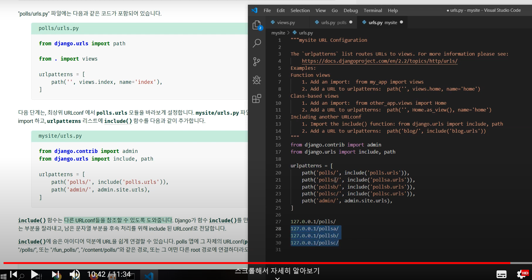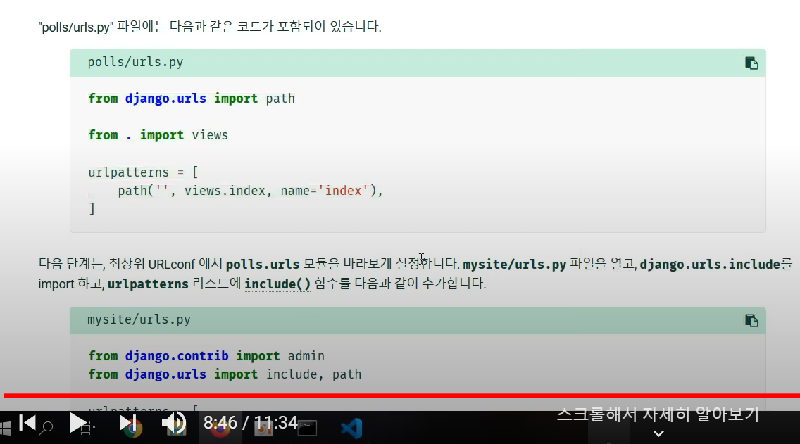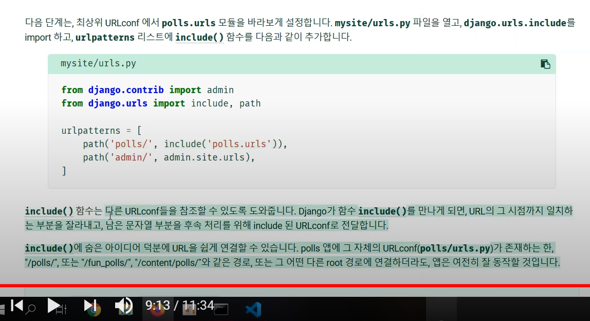 - 다음 단계는, 최상위 URLconf 에서 polls.urls 모듈을 바라보게 설정.