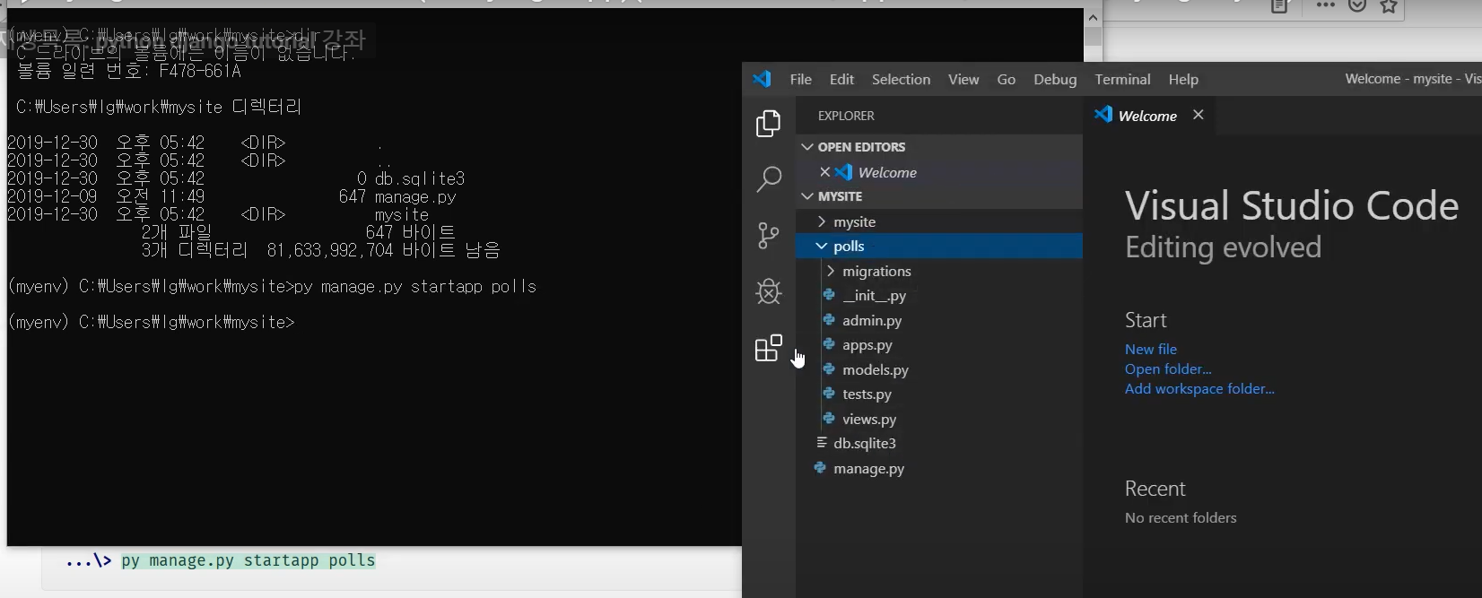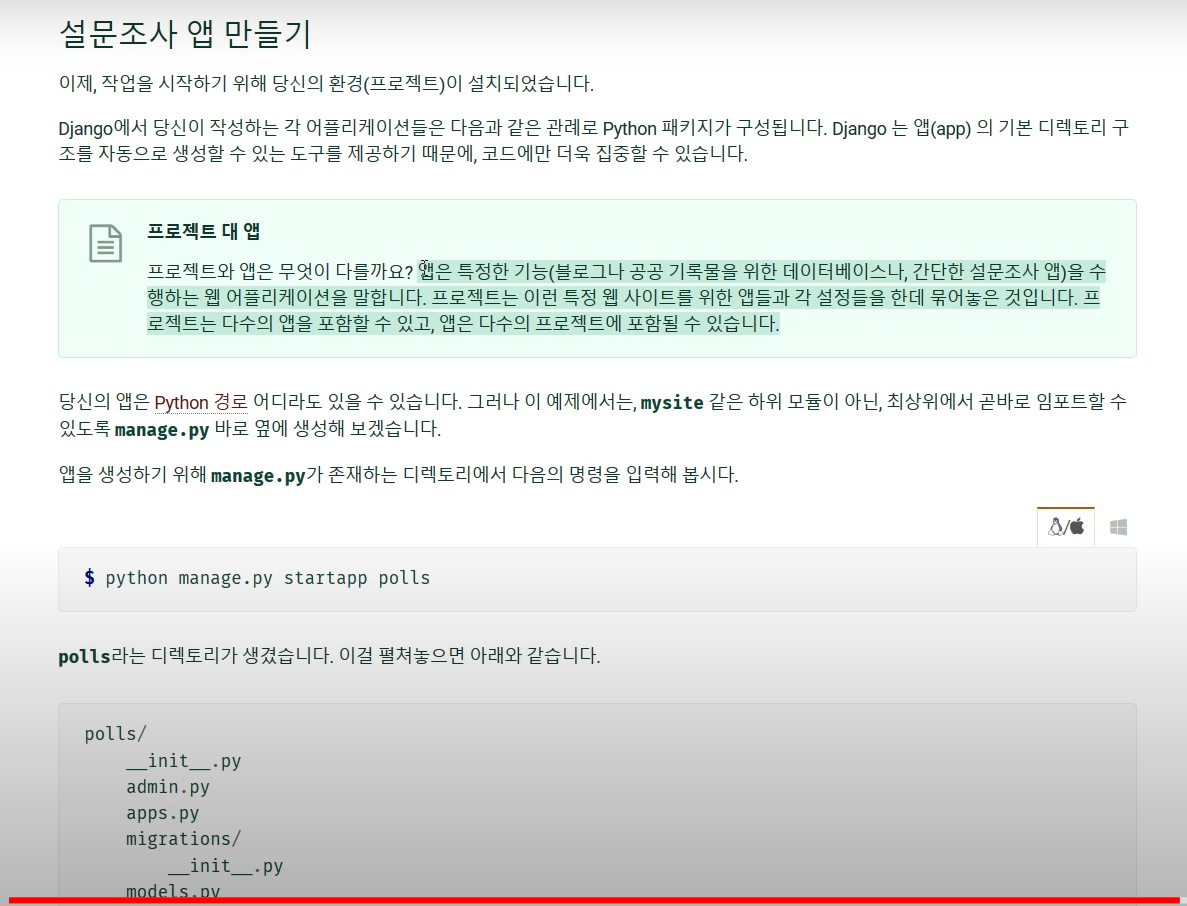 - py manage.py startapp polls (윈도우 명령어)