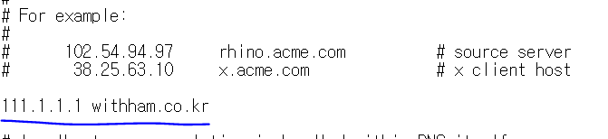 즉, hosts 파일에 withham.co.kr 도메인의 IP는 111.1.1.1 이라고 명시해주면 해당 도메인으로 서버 접근이 가능하다.