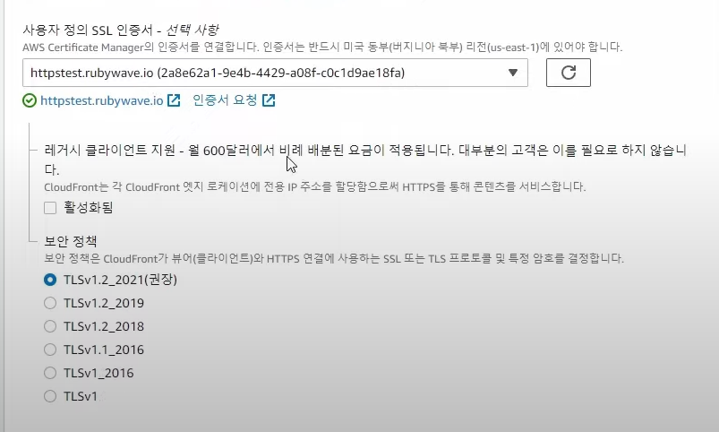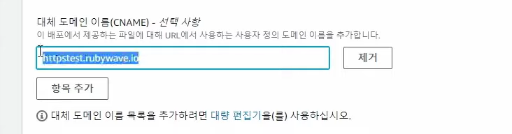 : 대체 도메인 이름 설정 (Cloudfront 에서 접속할 도메인 - 인증서 이름과 동일)