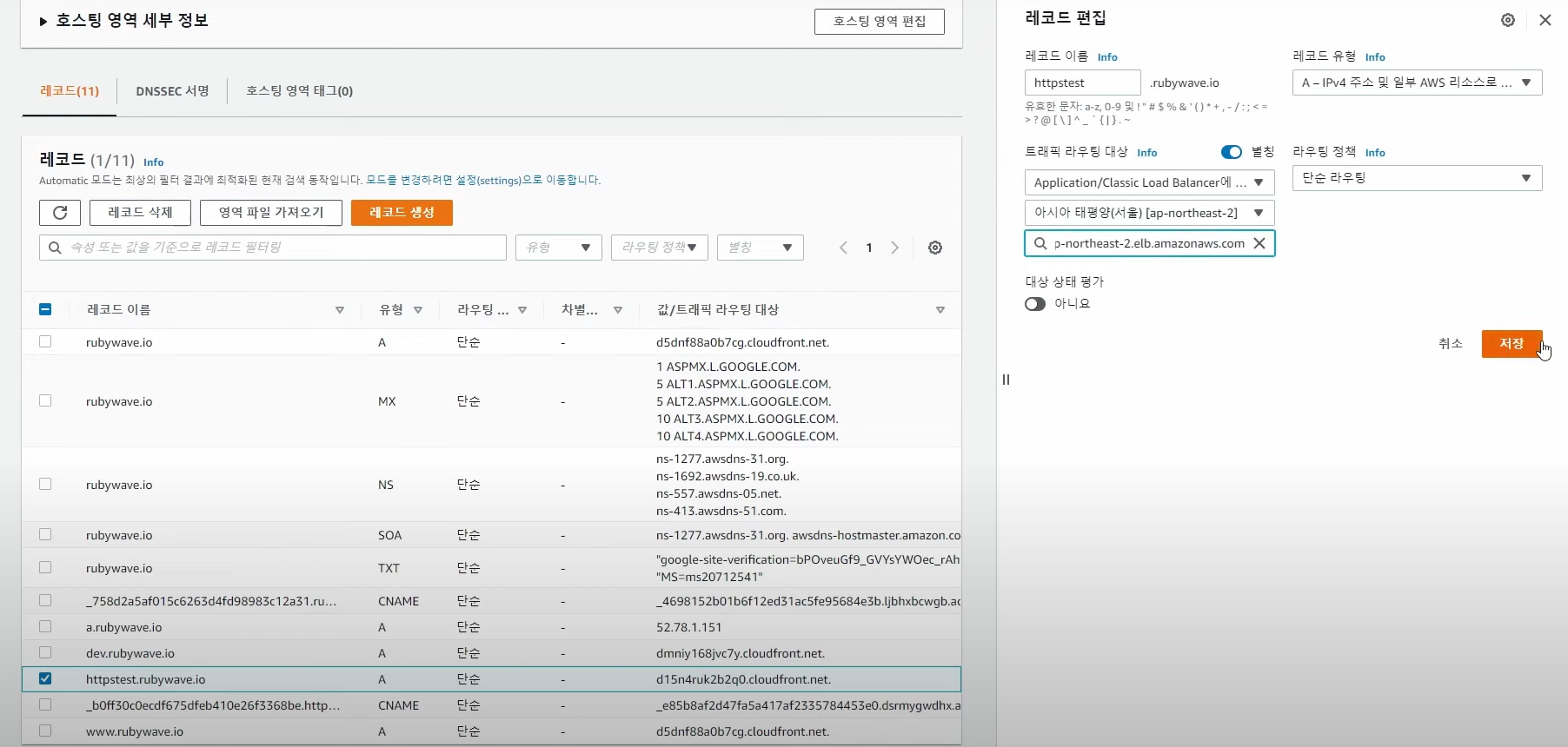 - Route53 이동후, 기존에 만든 httpstest 레코드 편집