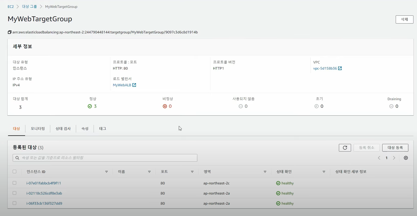 - 대상그룹에서 인스턴스 3개인지 확인