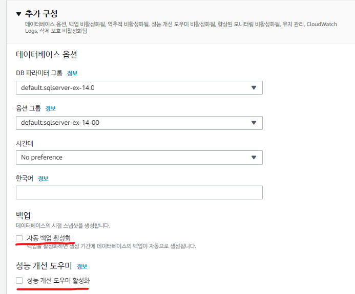 - 자동 백업 비활성화, 성능 개선 도우미 비활성화 (혹시 모를 과금 요소 제거) → 완료