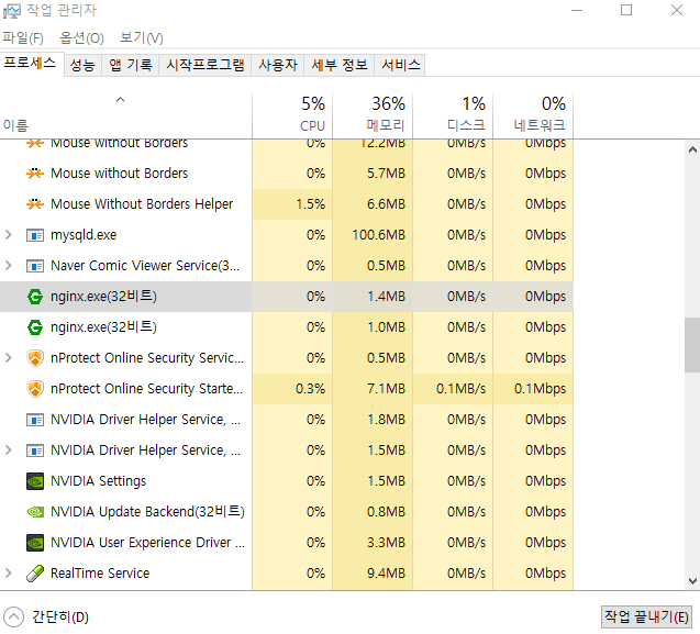 작업 관리자를 열어서 nginx.exe 선택 > 작업 끝내기(E) 를 누른다.