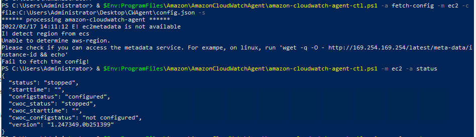 PS C:\Users\Administrator> & $Env:ProgramFiles\Amazon\AmazonCloudWatchAgent\amazon-cloudwatch-agent-ctl.ps1 -a fetch-config -m ec2 -c file:C:\Users\Administrator\Desktop\CWAgent\config.json -s