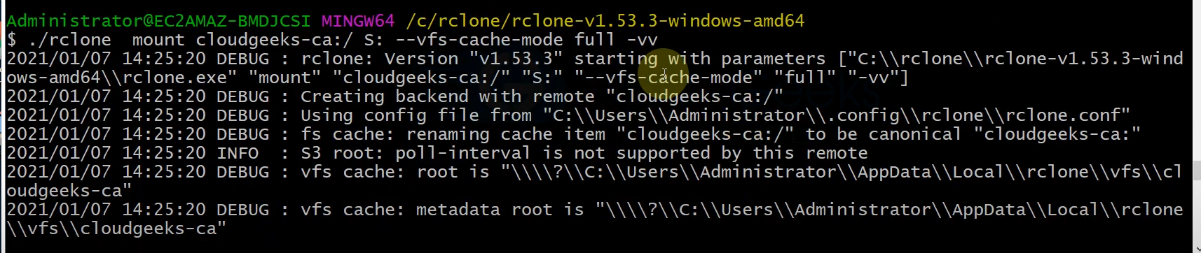 | ./rclone mount cloudgeeks-ca:/ S: --vfs-cache-mode full -vv | |