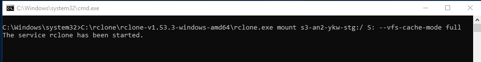 | C:\Windows\System32\cmd.exe /k cd c:\rclone & rclone mount blog-bucket01:blog-bucket01/ S: --vfs-cache-mode full | |