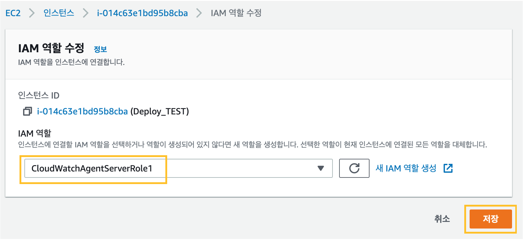 생성한 IAM 역할[CloudWatchAgentServerRole1]를 선택한 후 저장을 클릭합니다.