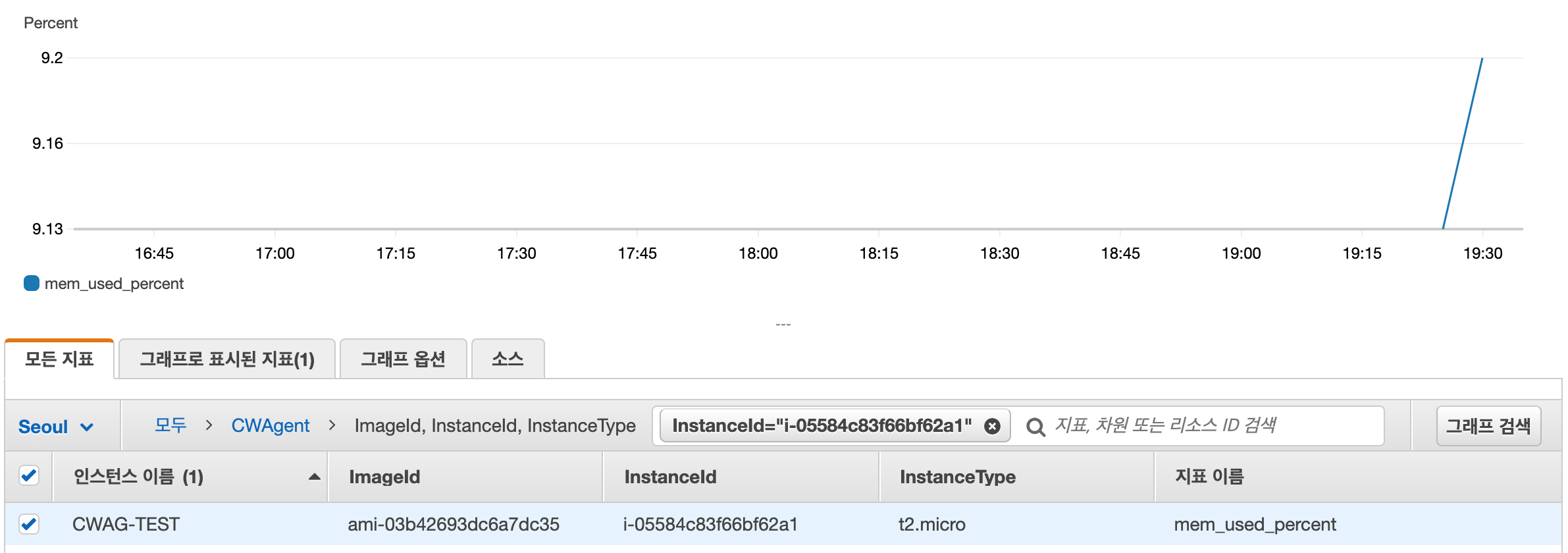 CloudWatch Agent를 설치해준 인스턴스를 선택하면 mem_used_percent가 나오는 것을 확인 할 수 있습니다.