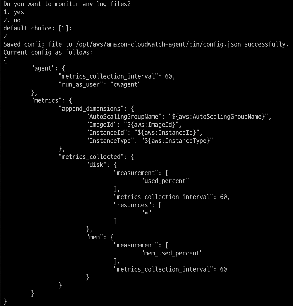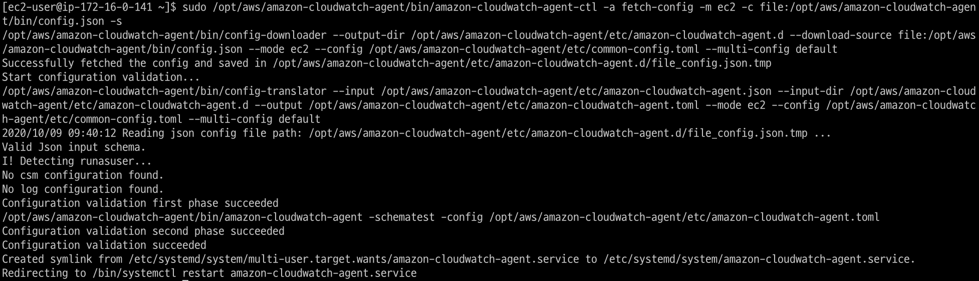 sudo /opt/aws/amazon-cloudwatch-agent/bin/amazon-cloudwatch-agent-ctl -a fetch-config -m ec2 -c file:/opt/aws/amazon-cloudwatch-agent/bin/config.json -s