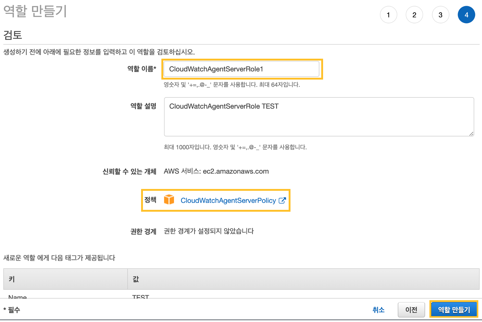 정책에 CloudWatchAgentServerPolicy를 확인하고 역할 이름을 작성합니다. 필요하다면 역할 설명도 작성 후 역할 만들기를 실행합니다.