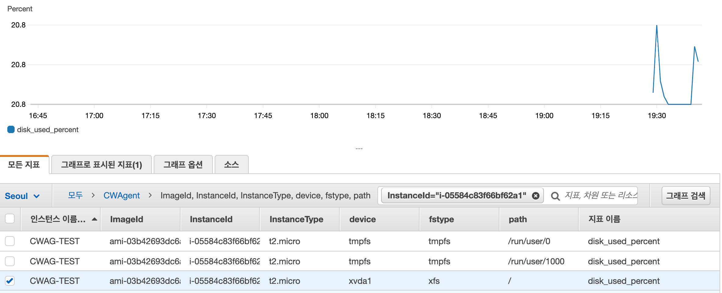ImageId, InstanceId, InstanceType, device, fstype, path 를 클릭합니다.