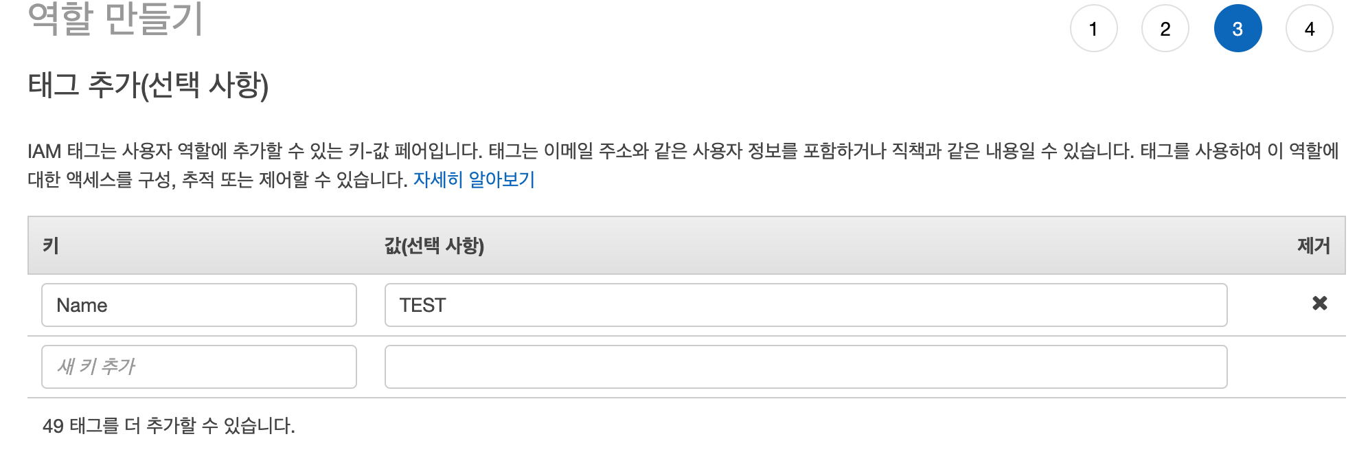 태그(옵션)을 추가합니다. 본인이 사용하는 Tag에 맞게 작성하여 관리하시는 것을 추천합니다. 이번 글에서는 테스트용이기 때문에 Name-Test Tag를 작성하도록 하겠습니다. 다음:검토 를 클릭합니다.