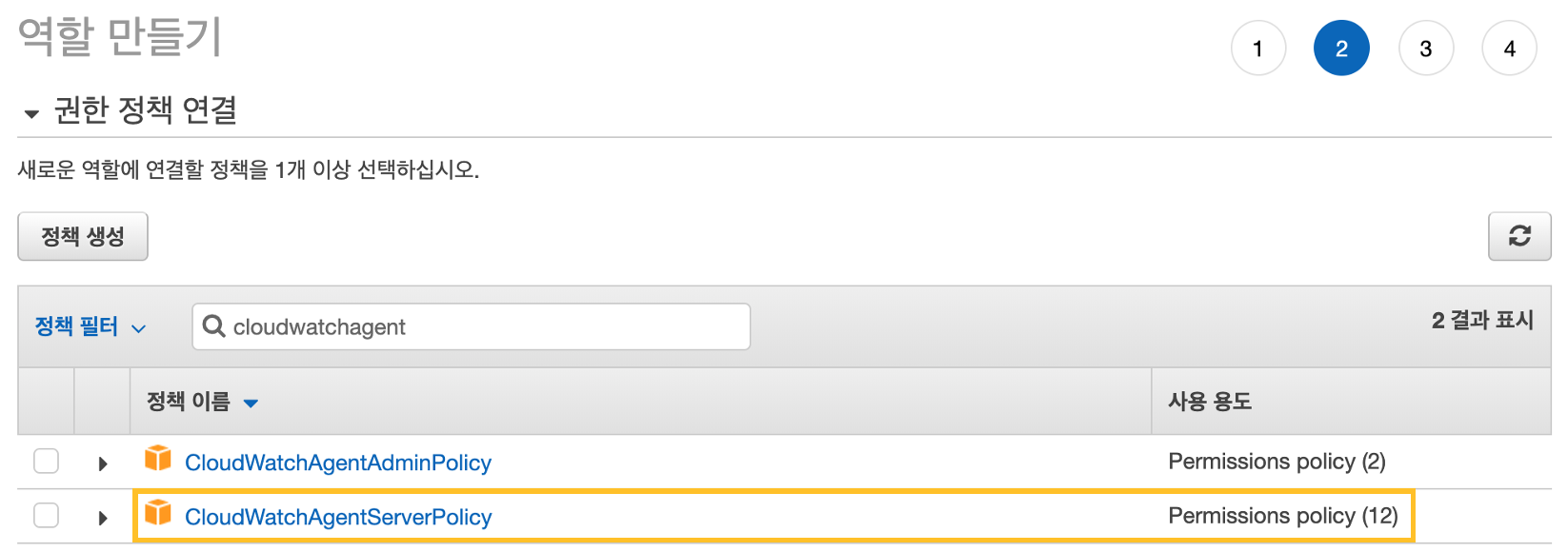 정책 필터에 cloudwatchagent > CloudWatchAgentServerPolicy 체크박스 선택 다음:태그 를 클릭합니다.