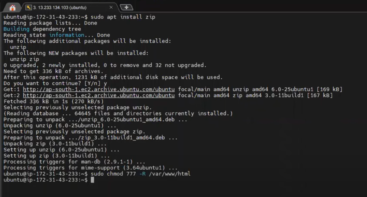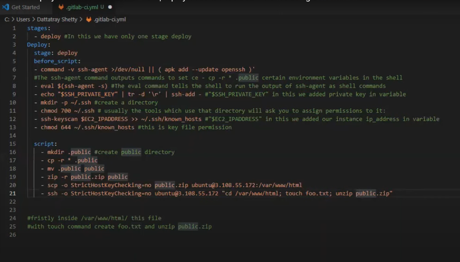 - ssh -o StrictHostKeyChecking=no ubuntu@3.108.55.172 "cd /var/www/html; touch foo.txt; unzip public.zip"
