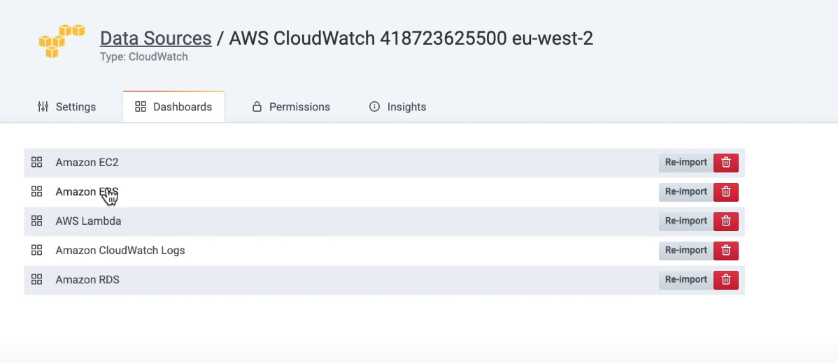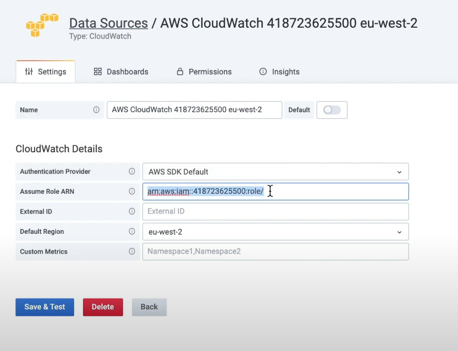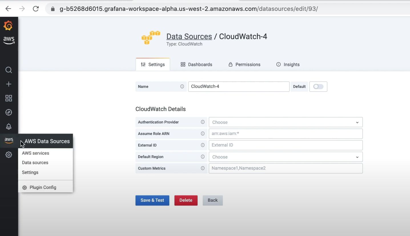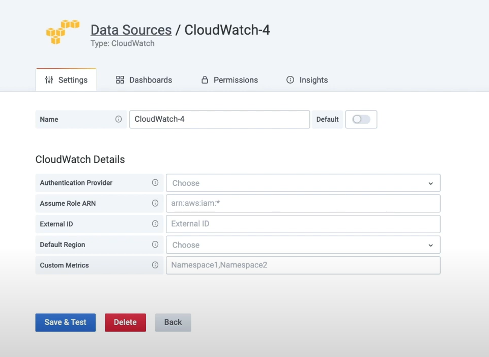 - [사용] AWS Data Sources --> Data sources --> Cloudwatch --> 해당계정 선택
