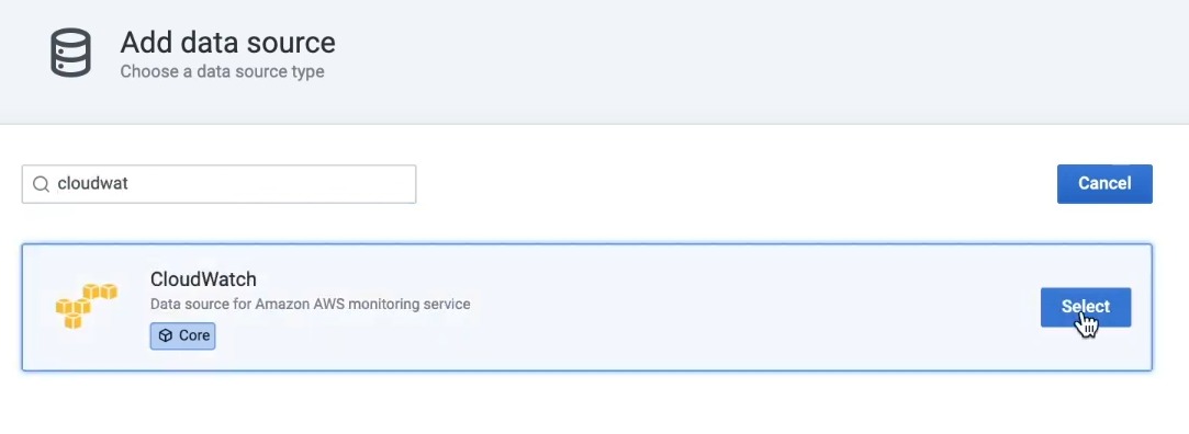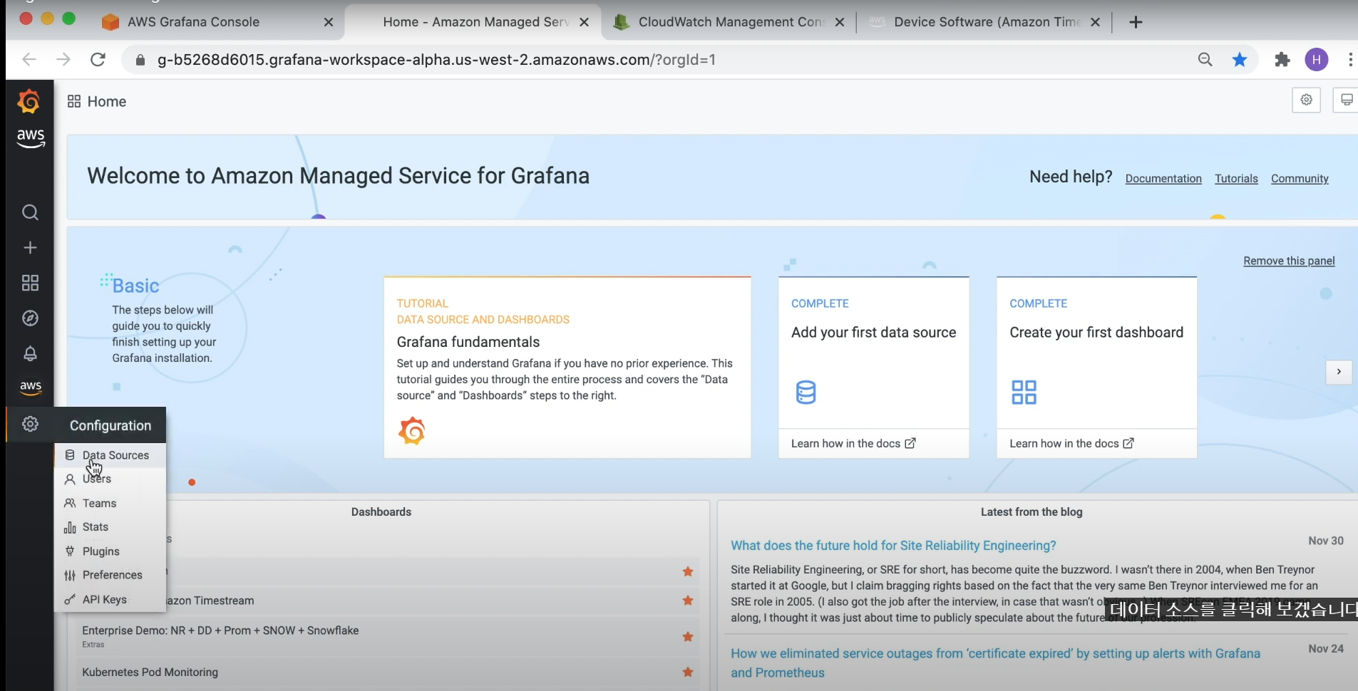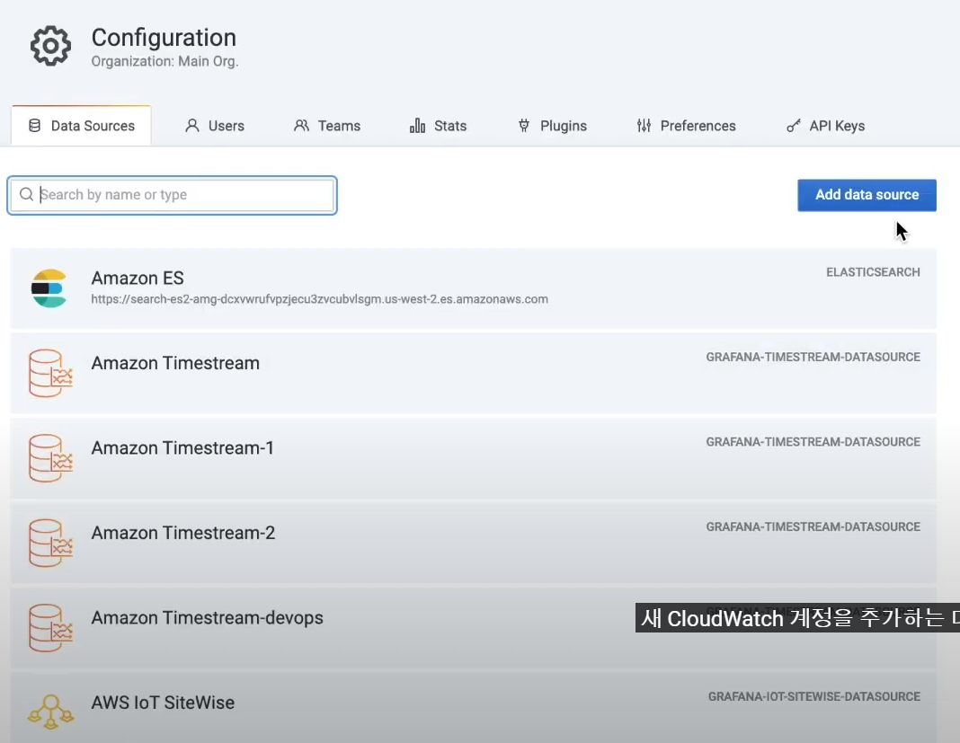 - [미사용 - 수동 생성시] URL 접속 --> Configuration --> Data Sources --> Add data source --> cloudwatch 선택