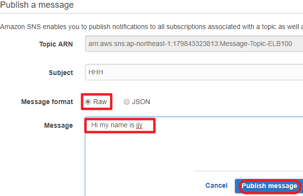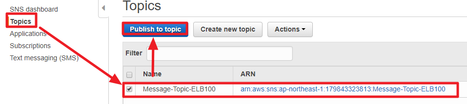 1) SNS 서비스 좌측의 Topics탭을 클릭한뒤 앞서 만든 Topic을 선택하고 Publish to topic을 클릭한다