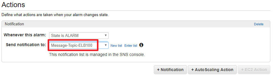 Send notification to : 알릴 대상을 지정한다 (앞서 생성한 Topic을 지정한다)