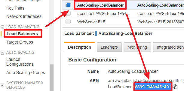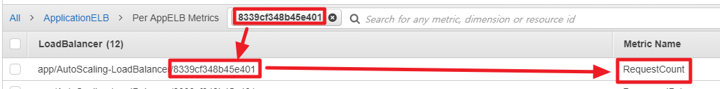 - 감시조건(Metric)을 설정할 ELB의 ARN의 끝자리를 복사해둔다
