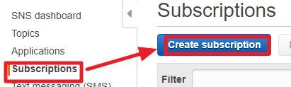 1) SNS서비스의 좌측의 Subscriptions탭을 클릭한뒤 Create subscription을 클릭한다